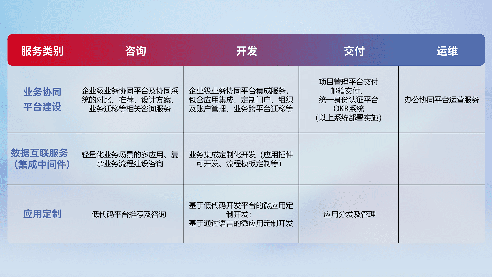 针对钉钉、、、、企微、、、、IDaas等平台级产品提供产品的规划、、、方案、、交付、、、定制化开发等服务,,实现如统一协同办公、、、、智能客户服务、、、混合会议管理、、智能数据查询、、等业务场景,,,,实现数字化转型。。。